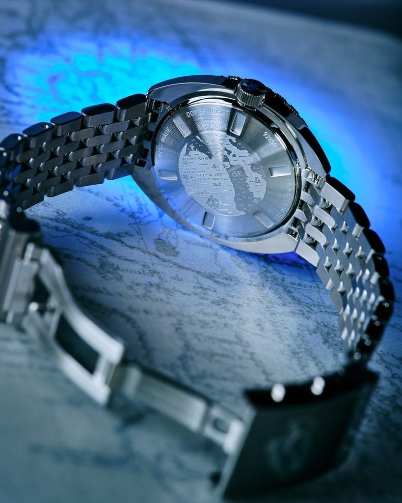 On retrouve également la lunette tournante unidirectionnelle emblématique de DOXA, dotée de profondes encoches en forme de dents de scie et de doubles graduations, permettant au plongeur de calculer à la fois le temps de plongée écoulé et les paliers de décompression « sans arrêt » conformément aux tables de plongée de la marine américaine. Ces gravures sont remplies de laque bleu marine, assortie aux index horaires du cadran. La montre est complétée par un verre saphir plat traité antireflet, en hommage au modèle original DOXA de 1968.