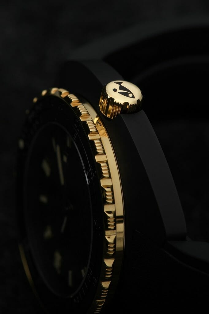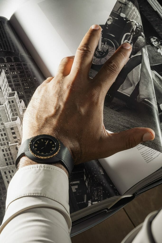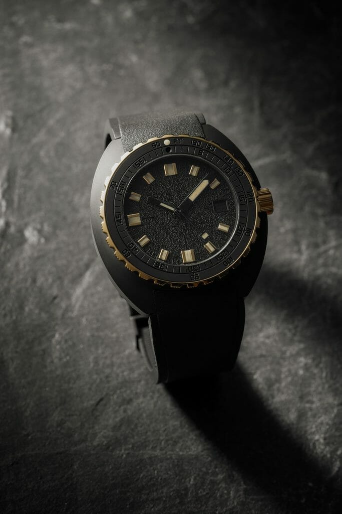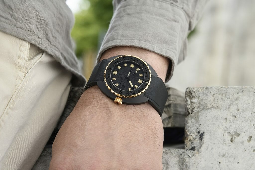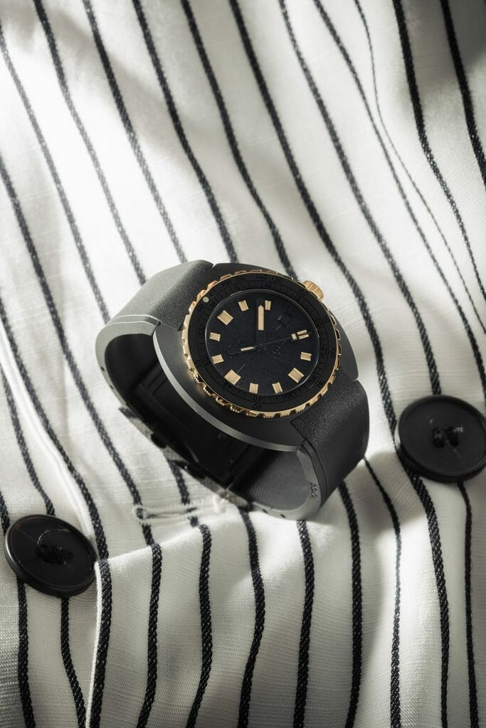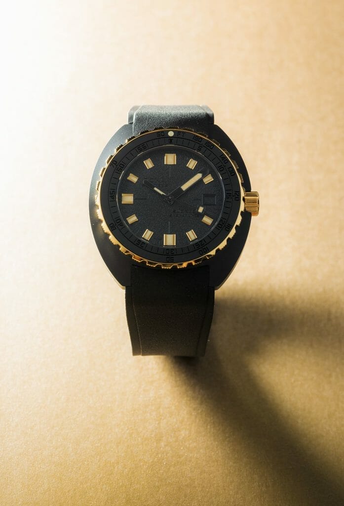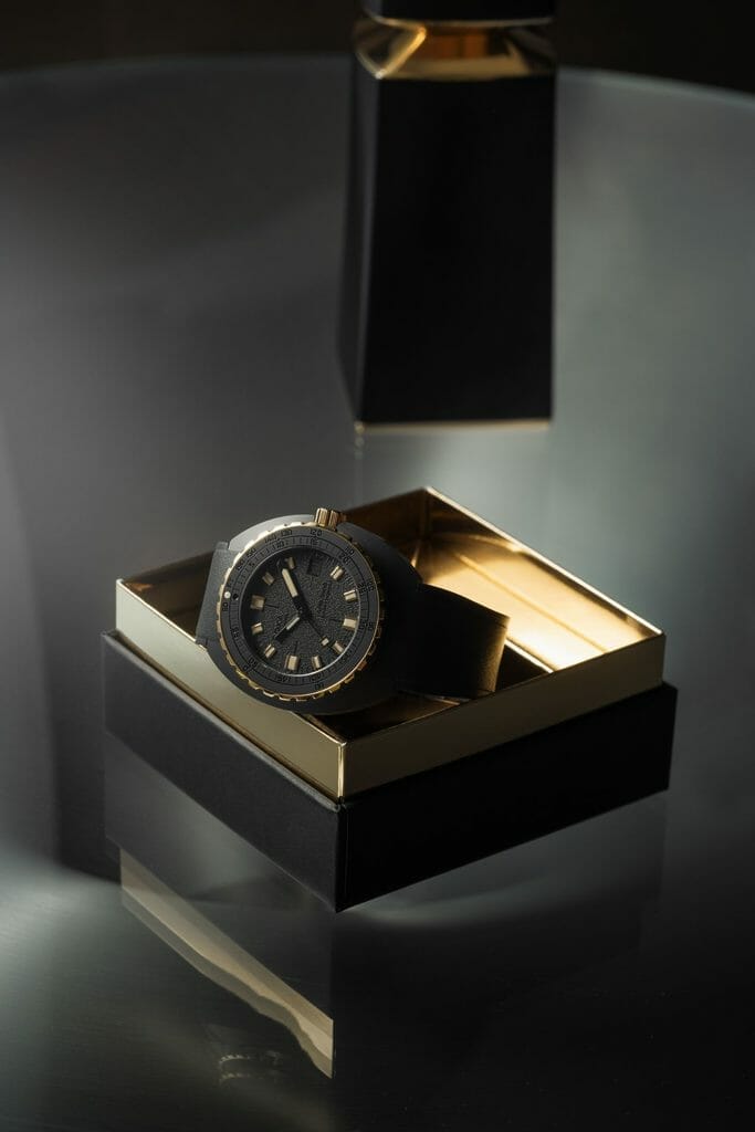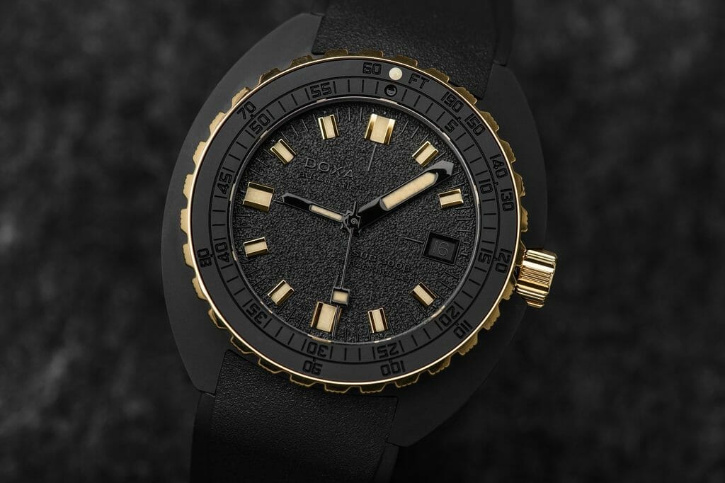 Le résultat est une forme d’extravagance avec un sens des proportions et un choix de matériaux qui relie la montre à notre temps. Une façon de juxtaposer des éléments qui semblent avoir toujours attendu ‘sous la surface’ : le boîtier en céramique noire, le cadran grainé mat avec des marquages noir sur noir… avec le contraste lumineux des informations essentielles fournies par les aiguilles et les index, ainsi que les composants fonctionnels de la lunette et de la couronne en or 18K 3N. Si la DOXA SUB 300ß est équipée d’un bracelet en caoutchouc FKM de couleur noire, souple, avec signes distinctifs DOXA sur ses deux faces, qui rend la montre particulièrement agréable au porté, elle n’en reste pas moins une véritable montre de plongée avec sa boucle déployante et extension de combinaison de plongée, toujours ornée du symbole «Poisson DOXA». Fidèle à l’esprit DOXA, une montre qui défie les conventions et repousse les limites. Et pourtant…