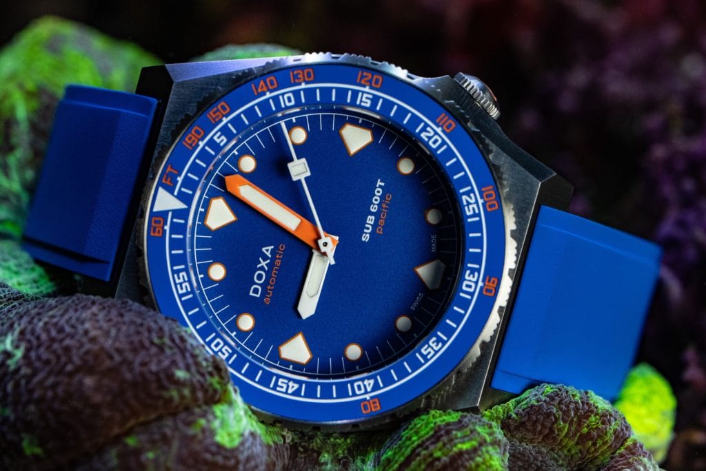 Tous les affichages relatifs à la plongée sont pourvus d’un luminescent Super-LumiNova® qui garantit une lisibilité optimale sous l’eau. Cette collection est disponible sur un bracelet en caoutchouc ton sur ton avec le cadran bleu Pacific. Un nouveau type de fermoir est utilisé pour la première fois chez DOXA. Visuellement il ressemble à une boucle ardillon mais c’est en réalité une boucle déployante, permettant d’ajuster facilement la longueur au poignet de son propriétaire. Sans oublier le symbole exclusif “Poisson DOXA ».