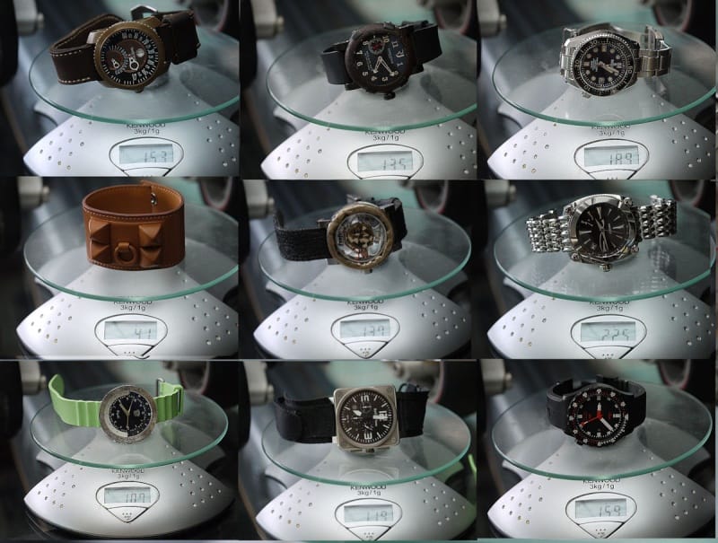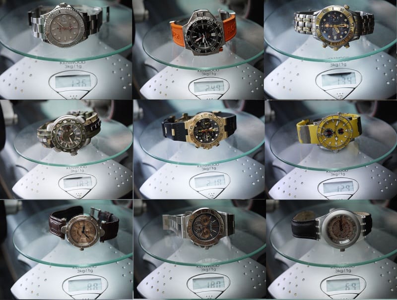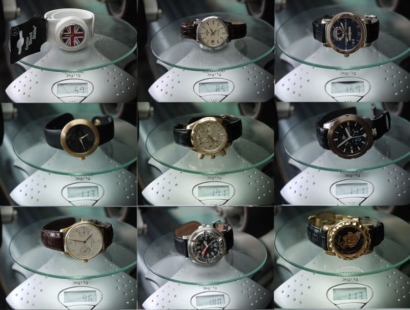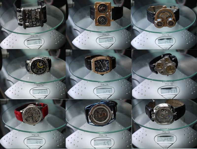 Voici un aperçu très partiel de sa collection horlogère, présenté sous un abord très original : celui du poids !