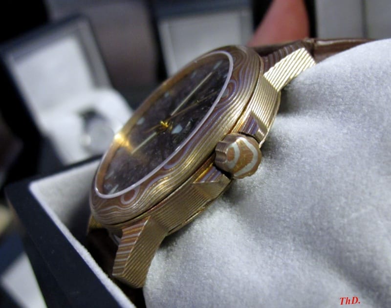 L’histoire commence sur un « rêve de gosse », selon ses propres termes : avoir une montre, jusque là tout est simple, mais une montre en damas. Ce qui complique un peu la chose… Très peu de montres sont réalisées sur ce principe, du fait des difficultés techniques et des allergies pouvant résulter d’un contact de ce matériau avec la peau. Il a donc fallu deux ans à Pierre pour constituer l’équipe qui allait réaliser sa montre.