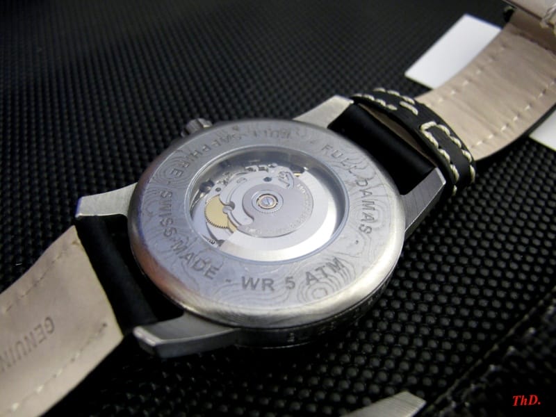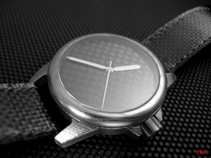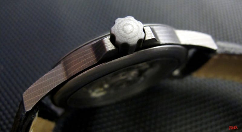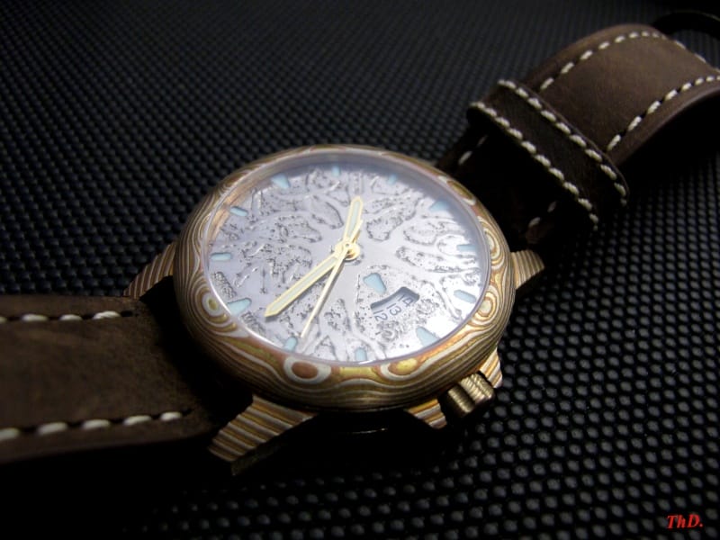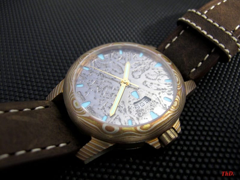 Chad Nicholson, forgeron américain, réalise le damas utilisé pour les boîtiers et couronnes, sur la base de deux aciers inox (304 L et AEB-L), et sans adjonction de feuilles intercalaires en nickel.