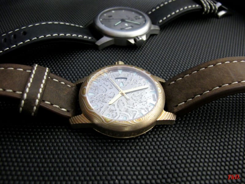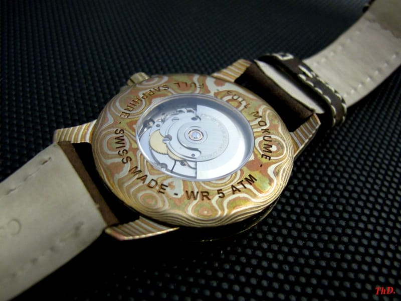 Une série encore plus limitée, à cinq exemplaires, est réalisée en mokumé (feuilles de cuivre et de laiton pliées à la forge), personnalisée avec des cadrans en acier 316L, révélant à l’acide un « Arbre de Vie », créé par Sylvie Muller, une artiste peintre.