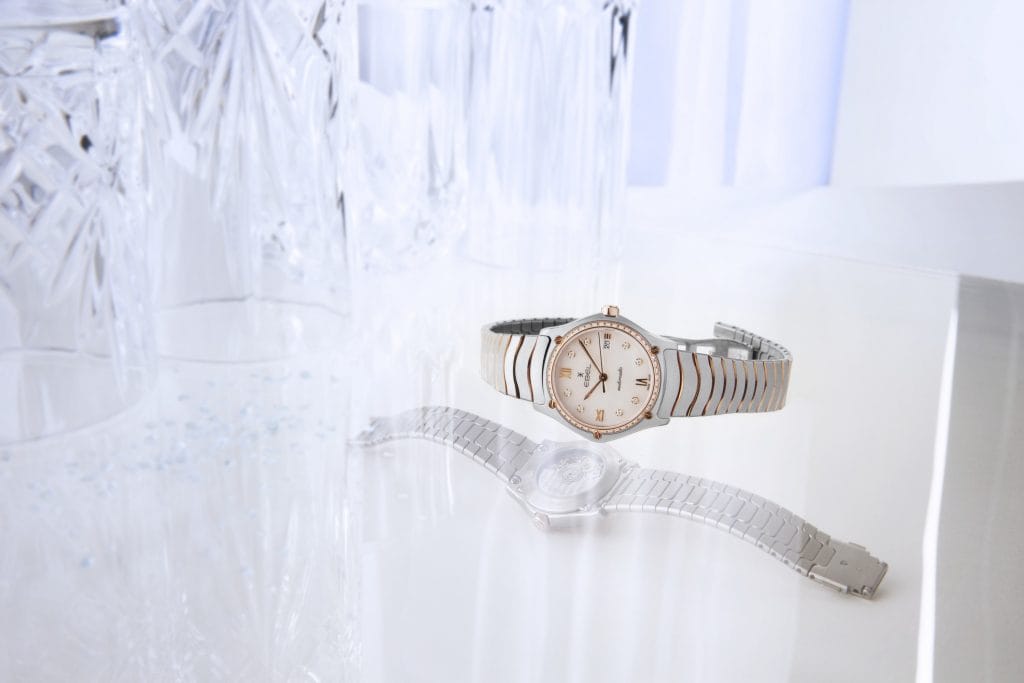 Sertie de diamants, la nouvelle montre EBEL Sport Classic Automatic Femme est le bijou idéal pour les fêtes de fin d’année. Le magnifique sertissage de 47 diamants de la lunette et du cadran nacré lui confère un glamour intemporel et un style unique. Disponible dans une version femme de 29 mm, ce garde-temps est le paroxysme du luxe et de l’élégance discrète avec une touche subtile rétro chic. Le contraste entre l’acier inoxydable brossé et l’or rouge18 carats poli du boîtier est saisissant. Le cadran nacré sublime quant à lui les chiffres romains plaqués or rouge ainsi que les huit index en diamant. Le fond du boîtier est doté d’une glace saphir qui permet d’admirer le mouvement automatique ETA 2000-1.