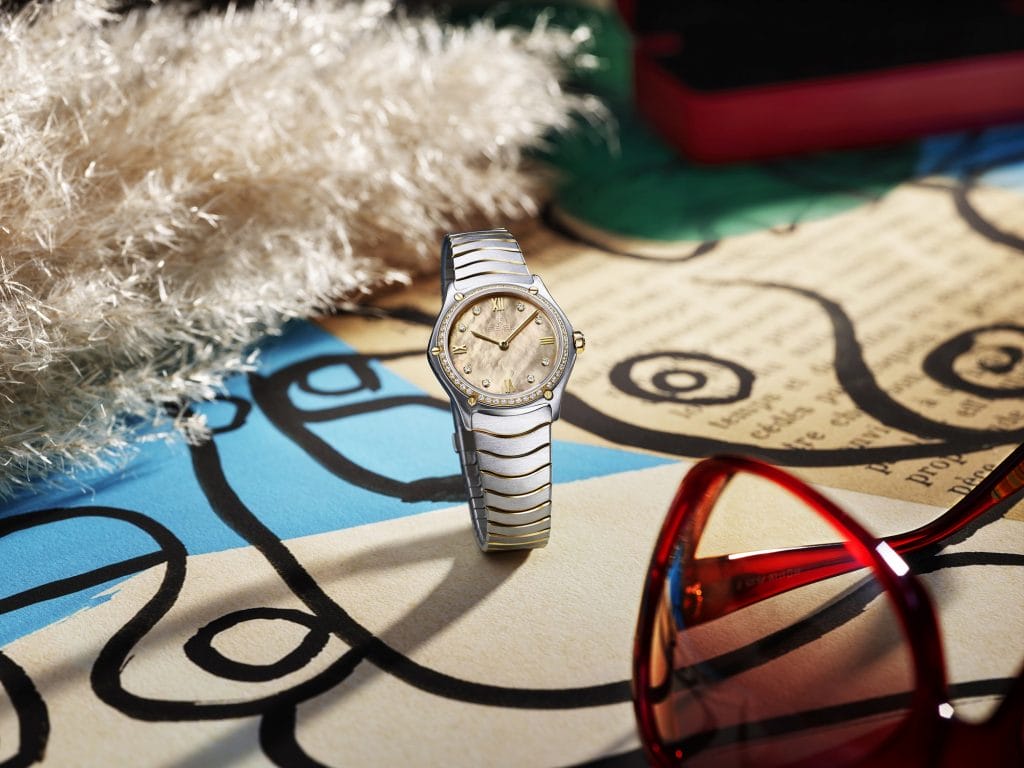 Associant formes épurées et rétro-glamour, la montre EBEL Sport Classic Lady Beige en nacre incarne chaleur, élégance et désinvolture.