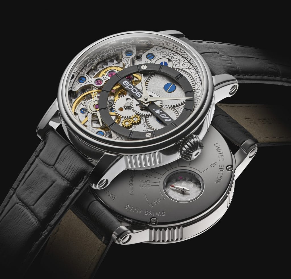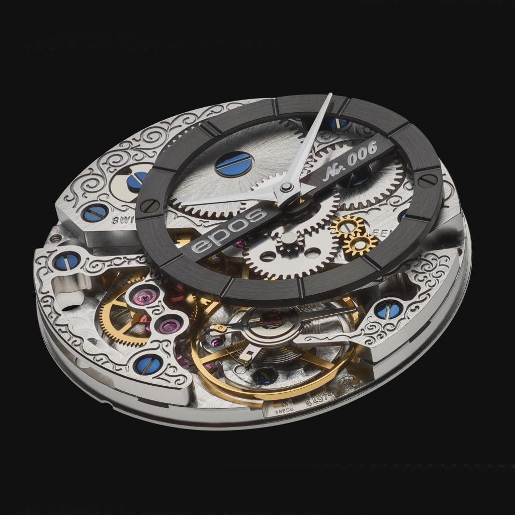 Afin de créer le modèle EPOS 3435 Verso, les ingénieurs d’EPOS ont repris le célèbre calibre historique ETA 6497 à remontage manuel et l’ont modifié de telle sorte qu’il expose désormais sur le bord du cadran du garde-temps toutes les merveilles du calibre mécanique. Le captivant tic-tac de la grande roue en or du balancier située en bas à gauche du cadran, assorti aux engrenages qui tournent inlassablement au-dessus, offrent un spectacle remarquable. Le calibre ETA 6497 à remontage manuel constitue une base fiable pour cette modification astucieuse. Dissimulée dans un boîtier en acier inoxydable de 42,5 mm de diamètre – étanche jusqu’à 50 mètres de profondeur –, la EPOS 3435 Verso à l’élégance intemporelle est une façon unique de lire l’heure. Le pulsomètre situé au dos du boîtier est une fonctionnalité des plus appréciées, et pourtant rarement intégrée, qui complète parfaitement l’esthétique somptueusement décorée du modèle.