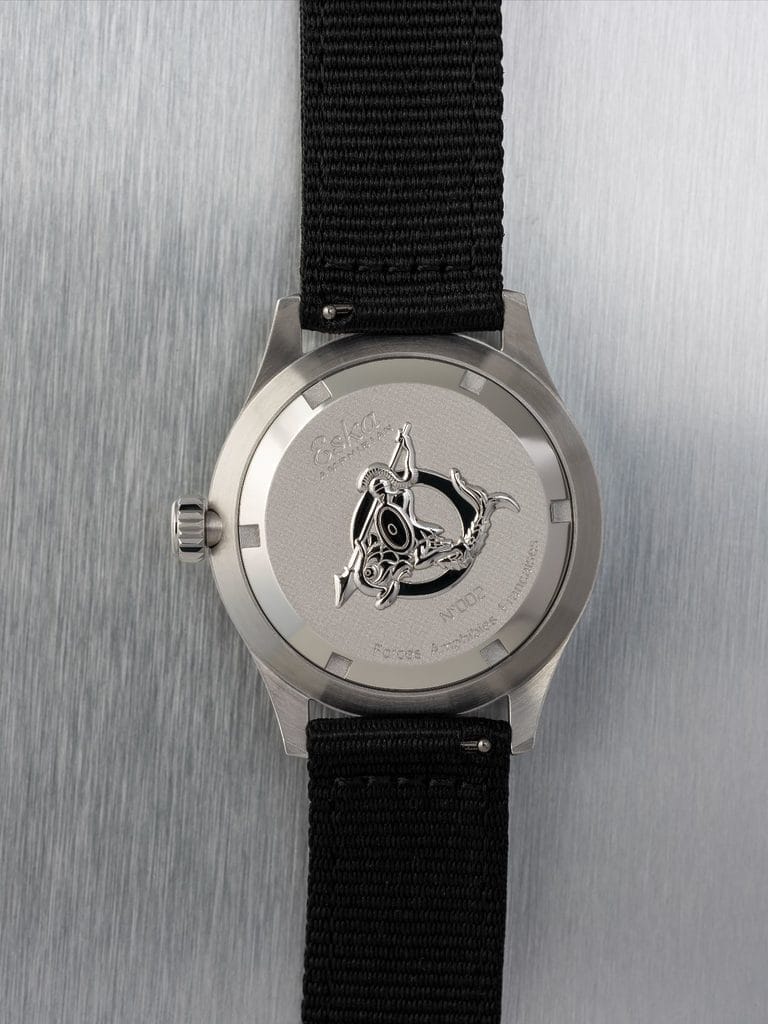 Le fond plein de la montre arbore l’insigne du brevet militaire des opérations amphibies françaises. Un guerrier armé d’une lance et d’un bouclier chevauchant un triton, figure mythologique amphibie par excellence. Ce symbole incarne la polyvalence, la mobilité et l’audace de ces unités, capables d’opérer à la frontière de la terre et de la mer.