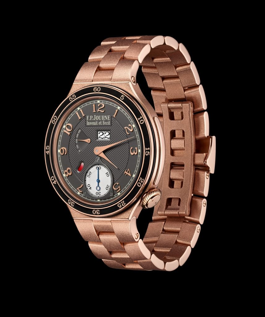 Le Centigraphe avec mouvement en Or rose 18 ct. à remontage manuel affiche les temps écoulés sur 3 cadrans, le 100ème de seconde à 10h, celui de 20 secondes à 2h et celui de 10 minutes à 6h. Le chronographe est mis en marche, stoppé et remis à zéro par une bascule brevetée ® à 2h sur la carrure au lieu des boutons classiques de chaque côté de la couronne. Le Centigraphe contribue à faire avancer les recherches médicales de l’ICM, Institut du Cerveau et de la Moëlle épinière à Paris. François-Paul Journe s’est engagé aux côtés du Professeur Gérard Saillant, Luc Besson, Jean Reno, Michelle Yeoh ou Jean Todt, entre autres, en reversant 30% du profit de la vente de chaque Centigraphe à l’ICM, et cela sans limitation de temps.