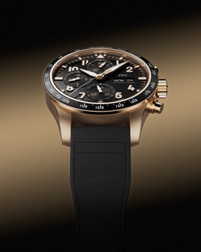 Pilot’s Watch Performance Chronograph 41 APXGP IW388309 : chronographe sportif en or rouge 18 K et bracelet caoutchouc noir, ce garde-temps de 41 mm abrite le calibre 69385 (46 h de réserve), avec petite seconde, totalisateur 12 h et 30 min, ajustement par poussoirs. Visible au poignet de Joshua Pearce (Damson Idris), il incarne l’allure et la technicité du personnage.