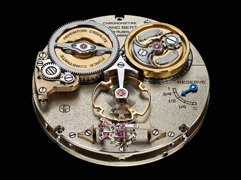 Pour atteindre le degré de performance chronométrique le plus élevé, la manufacture a opté pour certains choix techniques radicaux. En effet, le Chronomètre FB 2RE.2 est le fruit d’une combinaison inédite de deux mécanismes de régulation : il s’agit du seul garde-temps disposant d’un remontoir d’égalité une seconde, associé à la force constante d’un dispositif à fusée-chaîne.