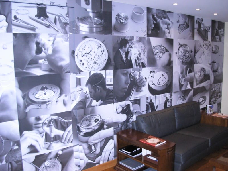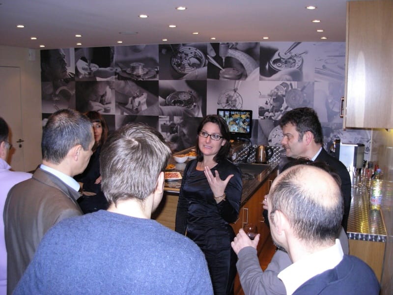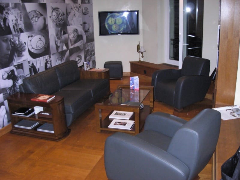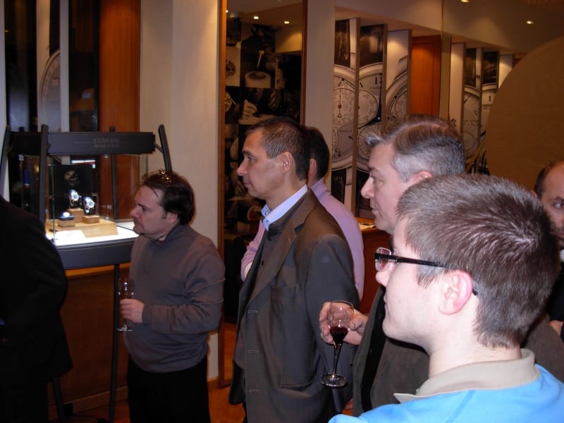 Une boutique claire, agréable à l’œil, et des hôtesses charmantes et très compétentes. Prise de contact, direction le premier étage, vestiaire et mise à l’aise. Une bonne surprise, pour commencer, vous aurez des photos ! Contrairement à ce que nous avait annoncé le message de préparation de la visite, il nous est possible de photographier les montres en vitrine. La restriction ne porte que sur des modèles spécifiques présentés sur plateau, dont vous aurez quand même des aperçus par le dossier qui nous a été remis à chacun. Discussions préalables, réchauffement, Lucas, déjà assailli par les amateurs.