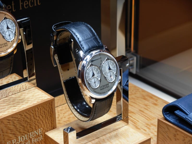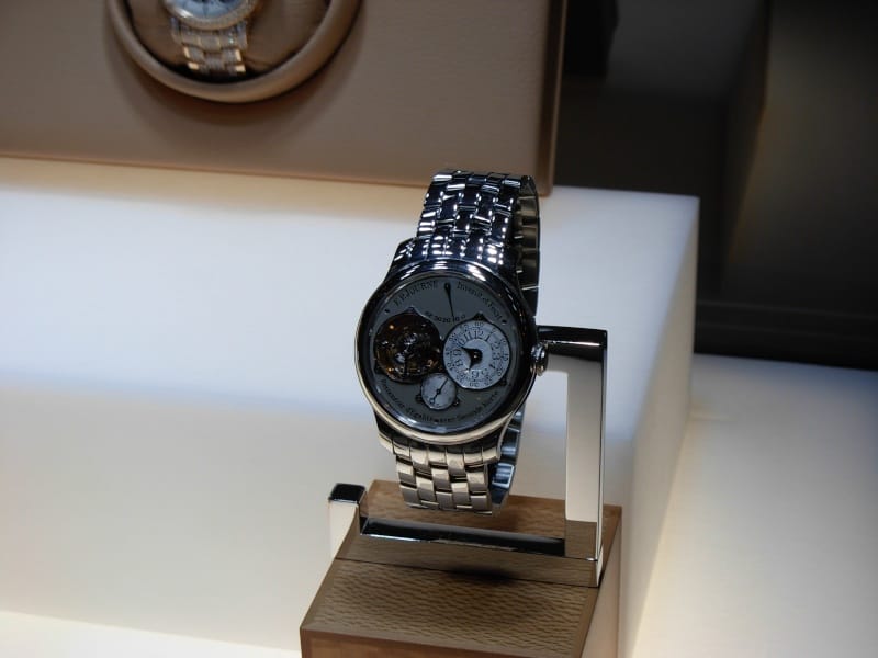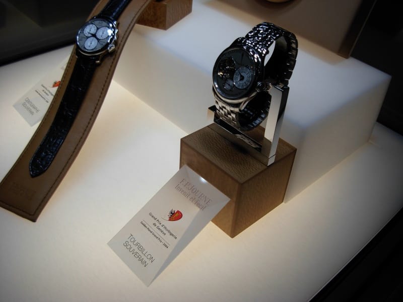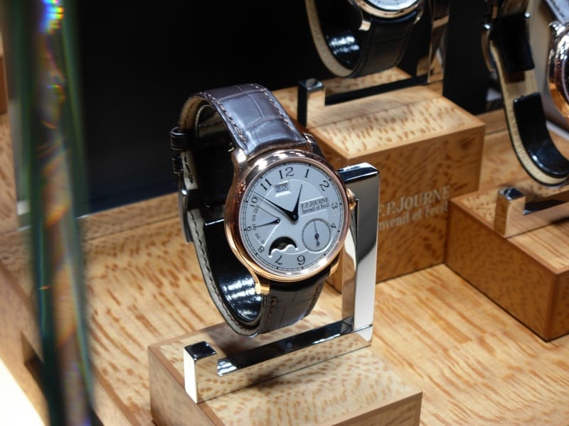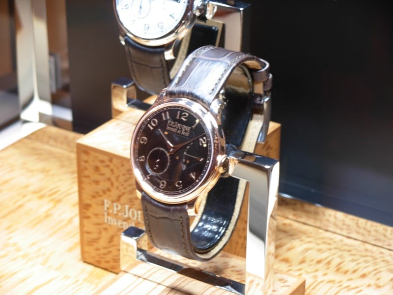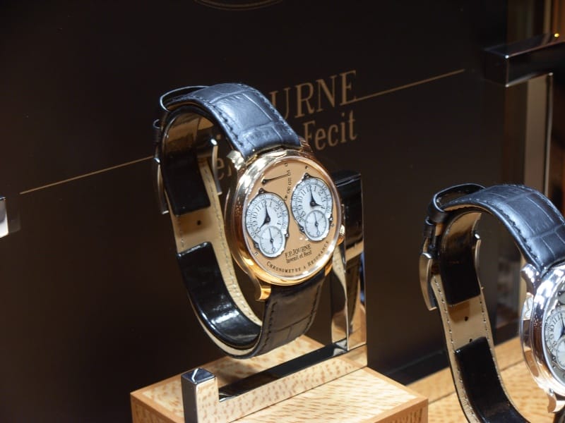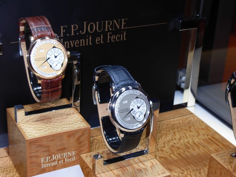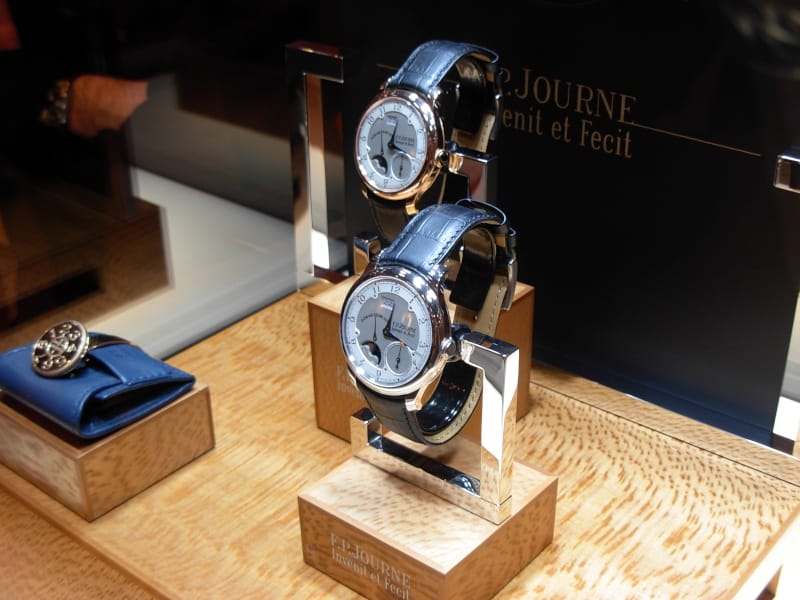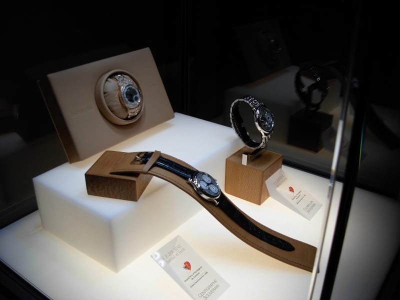 FP Journe a pris le parti de n’exposer que des boîtes dédiées à cette exposition, vides. (Seuls quelques modèles exposés au premier étage sont complets).