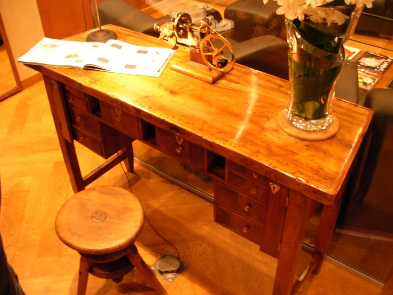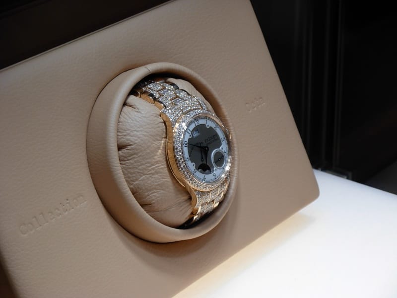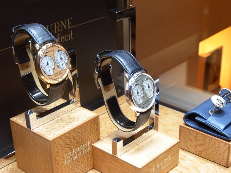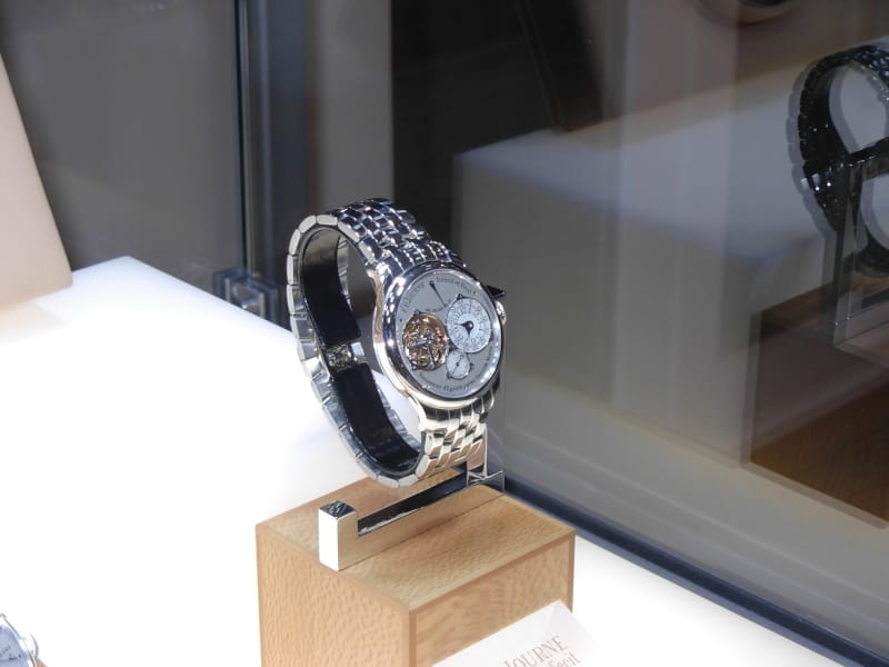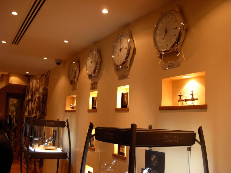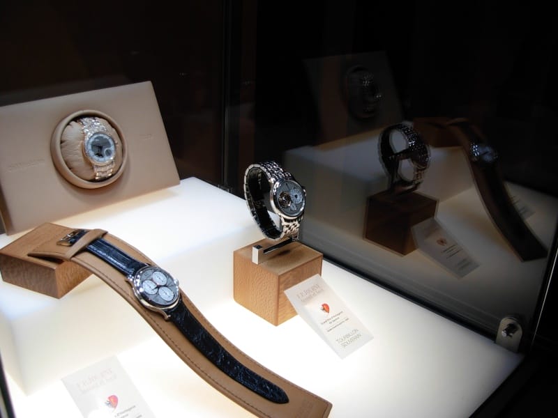 Anecdote concernant les montres exposées en vitrine dans la boutique, une approche qui ravira les amateurs de montres, inquiets de se voir proposer un exemplaire provenant de la vitrine, avec ce que cela comporte de risques en terme de rayures, exposition prolongée aux UV, à la chaleur, de vieillissement des huiles, etc.