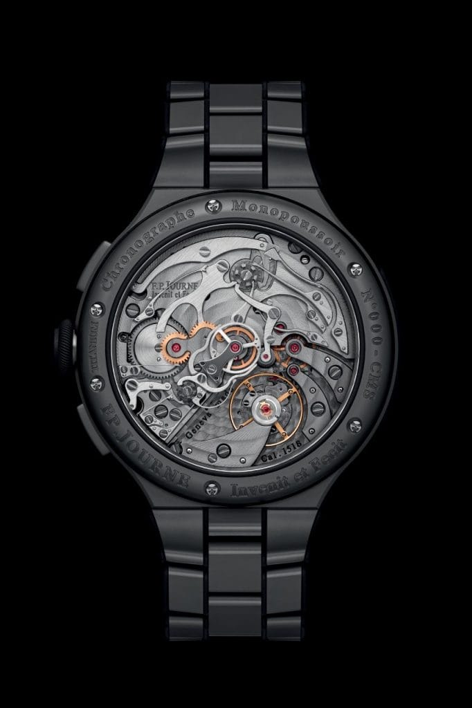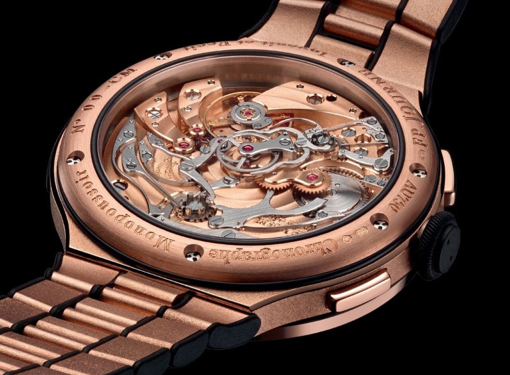 Les magnifiques finitions et décorations du mouvement visibles à travers un fond en saphir transparent sont une des qualités incontestables de la haute horlogerie F.P.Journe.