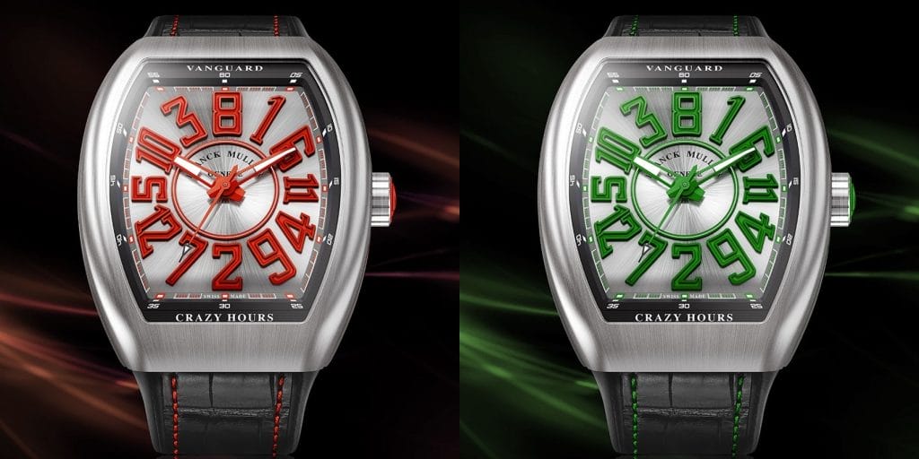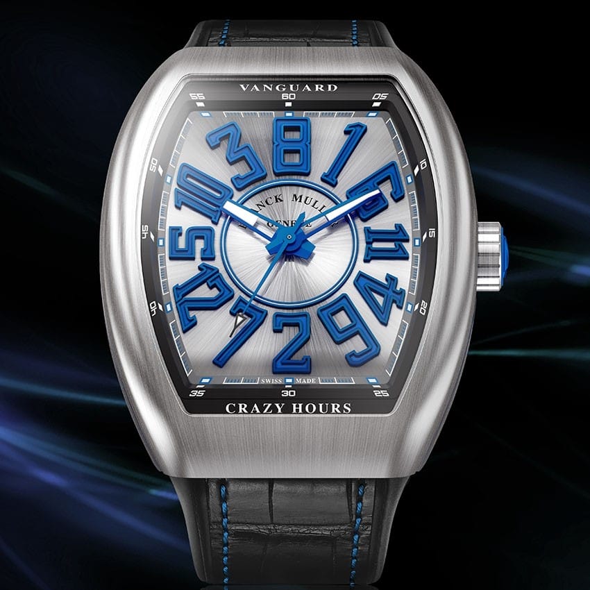 La complication la plus iconoclaste de Franck Muller : la Crazy Hours™, est mise en valeur dans un boitier Vanguard™ aux courbes sportives et aux chiffres colorés appliqués à la main. La matière est mise à l’honneur, avec l’utilisation d’acier brossé pour la boite et le cadran. Un esthétisme qui est à la hauteur de l’excentricité de la complication, avec les chiffres iconiques de la collection Vanguard™, appliqués à la main, en bleu, rouge, vert ou orange qui semblent se détacher du cadran en acier brossé. Les contours des aiguilles luminescentes s’accordent avec la couleur des chiffres reliefs et les lignes de la boite ont été travaillées pour lui conférer un caractère sportif et moderne.