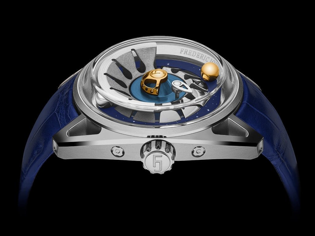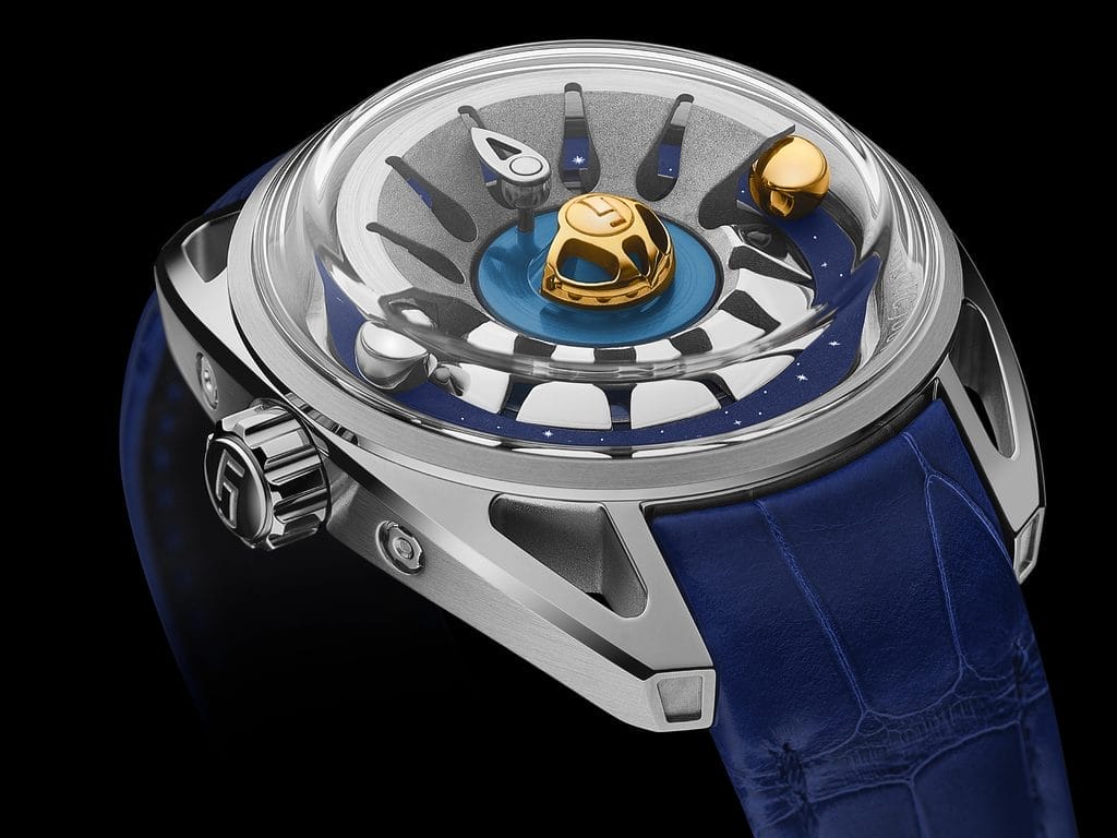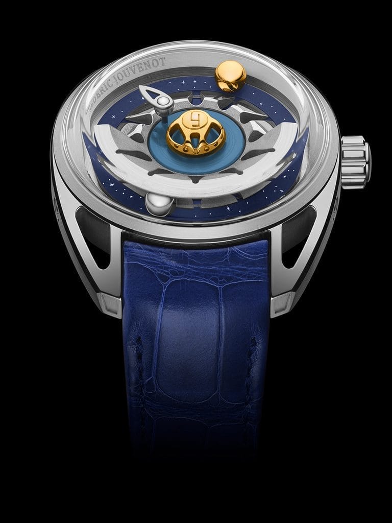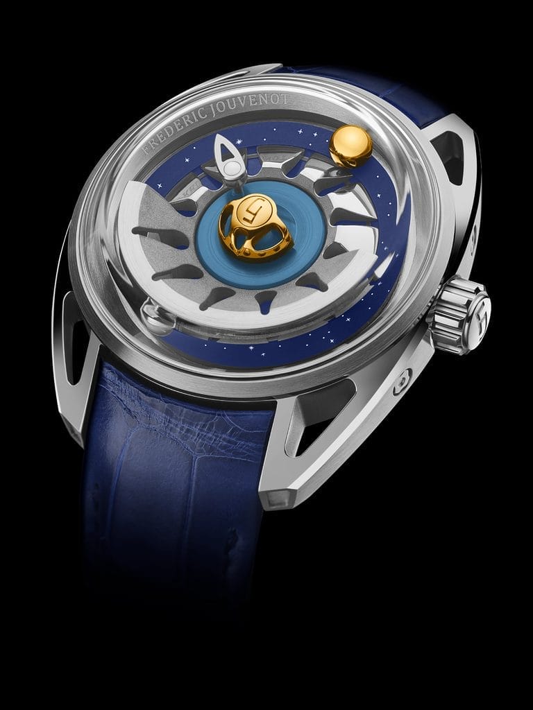 Au centre de cette montre, un cadran unique illustre le cycle des 24 heures à travers une représentation dynamique de la Lune et du Soleil. Une aiguille des heures excentrée évolue autour de motifs célestes stylisés, tandis qu’une aiguille des minutes en relief au centre du cadran apporte un contraste visuel saisissant. Son verre saphir, conçu sur mesure, épouse parfaitement la forme du boîtier et met en valeur son architecture contemporaine, tout en affirmant son origine suisse.