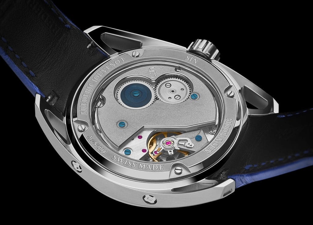 Les ponts sont ornés de motifs architecturaux et de lignes structurées, reflétant l’engagement de Frédéric Jouvenot pour l’excellence horlogère.