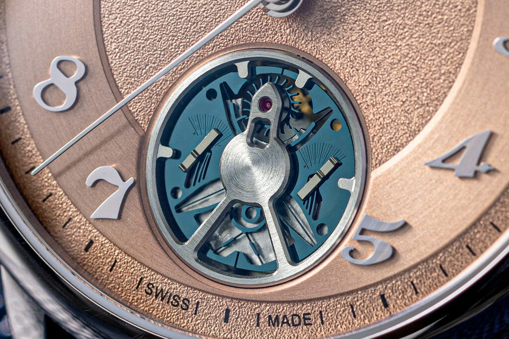 Le cadre permet également d’empêcher l’oscillateur de plier au point de rupture, un peu comme un dispositif anti-choc. Seule la petite roue d’échappement en silicium est fixée sur un axe. Lorsqu’elle bouge, le mouvement de l’oscillateur est à peine perceptible. Cependant, un regard sur les aiguilles des secondes nous montre si le garde-temps est en mouvement. À ce sujet, avec 80 alternances par secondes, l’aiguille semble flotter mystérieusement sur tout le pourtour du cadran.