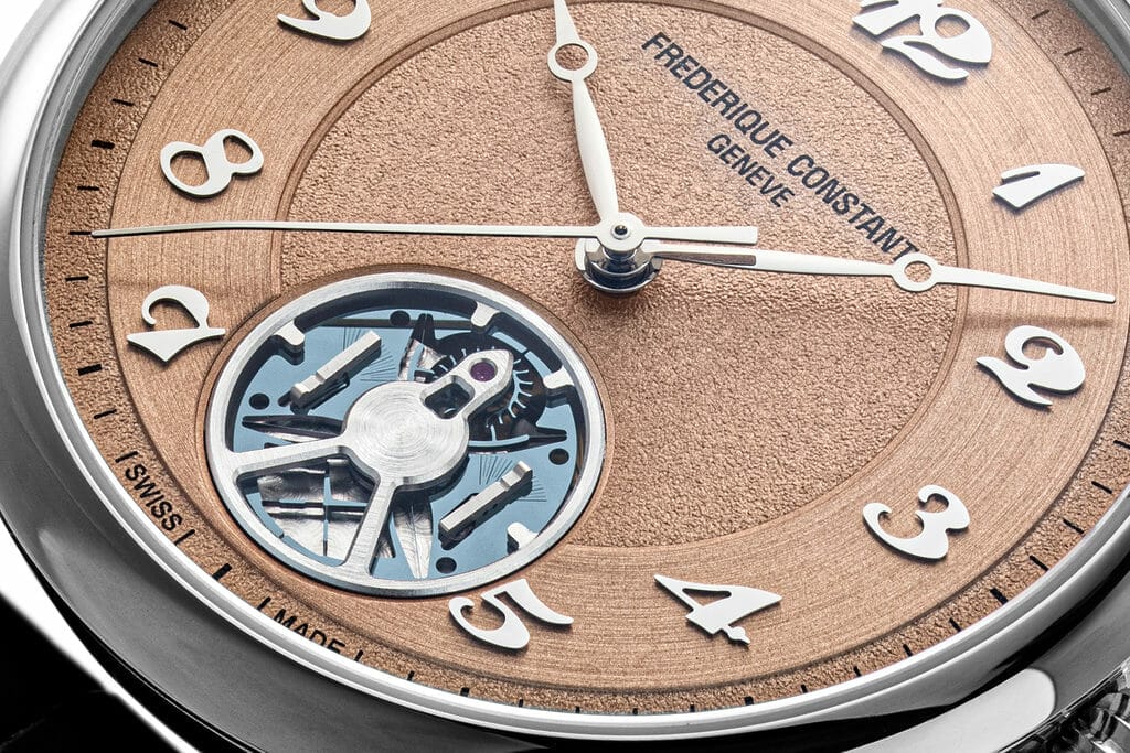 Frédérique Constant a poussé la performance à l’extrême, avec une fréquence de 40 hertz, ce qui est dix fois plus rapide qu’un mouvement mécanique conventionnel. La première exigence était de trouver un moyen de réguler de manière efficace l’oscillateur, ce qui a été accompli en ajoutant deux petites masses qui sont utilisées pour changer l’inertie du balancier. Même la plupart des changements de position des minutes pour ces éléments résulte en une énorme différence de performance en matière de chronométrage, c’est pour cela que les horlogers Frédérique Constant ont développé leur propre expertise en les régulant. Ensuite, l’oscillateur monolithique n’est fixé à aucun axe pour le mouvement. À la place, il tient en place grâce à l’incroyable pont qui agit en tant que cadre pour le retenir.