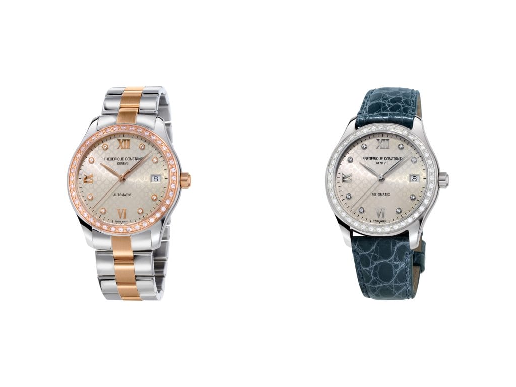 Tout en rondeur sensuelle, le boîtier de 36 mm de diamètre, décliné en acier ou bicolore acier plaqué or rose, se pare d’une lunette sobrement épurée ou scintillante de mille feux avec ses 40 diamants. Doté d’un fond soleillé embossé, ponctué de diamants et de chiffres romains, le cadran – blanc, bleu ou gris clair – dévoile à 12 heures une ouverture. Devenue emblématique de Frédérique Constant au fil des années, elle invite les passionnées d’horlogerie à contempler le battement de cœur du mouvement automatique. Plus sobres, les deux autre nouveautés présentent un cadran tout aussi soigné mais avec un guichet de date à 3 heures, rehaussant le design de l’ensemble avec grâce et style.
