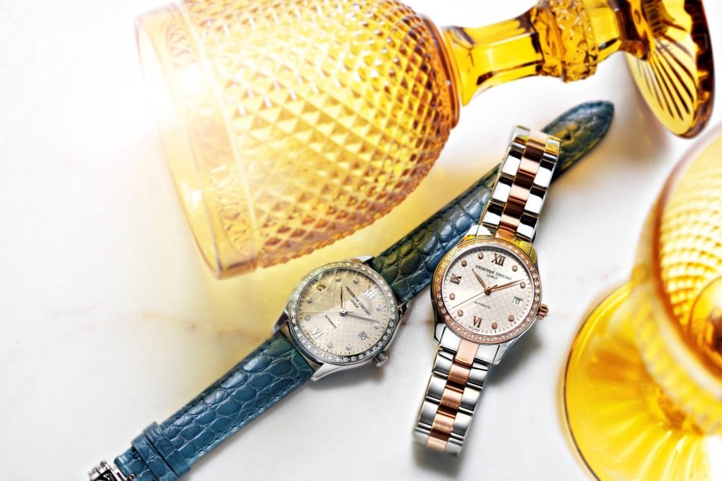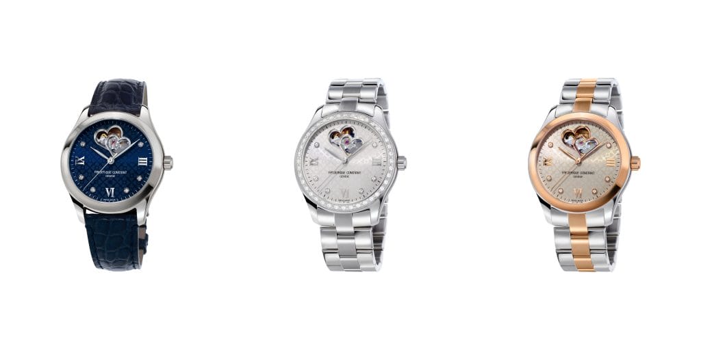 Equipées d’un fond ajouré transparent, les Ladies Automatic permettent d’admirer les rouages de leur mouvement à remontage automatique. Trois d’entre elles sont animées par le calibre FC-310 agrémenté d’un décor colimaçon, affichant les heures, les minutes ainsi que l’ouverture double Heart Beat à 12 heures. Les deux autres sont alimentées par le calibre FC-303, également orné d’un décor colimaçon, présentant les heures, les minutes et la date à 3 heures. Dotés de 26 rubis, ces deux calibres suisses oscillent à 28 000 alternances par heure et offrent une réserve de marche de 38 heures pour une étanchéité de 50 mètres.