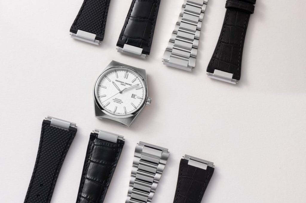 Non seulement la Maison Frederique Constant est parvenue à trouver cette parfaite continuité, mais elle lui offre, en plus, un système de changement rapide de bracelet. Sans outil ni accessoire, il devient possible de changer l’esthétique de sa montre. Pour passer d’un look sportif à urbain ou chic, il suffit d’une simple pression à l’extrémité du bracelet pour le détacher de son boîtier et, de cliquer un nouveau bracelet à la même place tout aussi facilement. Du cuir à l’acier, au crococalf suede en passant par le caoutchouc, la Highlife s’habille et se rhabille en quelques secondes.