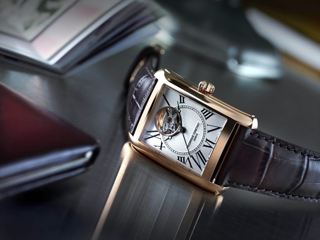 Frédérique Constant fait renaître la forme carrée classique avec une montre d’inspiration rétro. Dans les années 1920, les montres carrées étaient particulièrement populaires auprès des femmes. À la même époque, les hommes abandonnèrent les montres de poche rondes traditionnelles pour des montres-bracelets. Pour rompre avec la tradition tout en proposant des modèles plus pratiques à fabriquer, les horlogers se sont naturellement tournés vers la forme carrée, facilement associable à un bracelet en cuir. Les chasseurs de tendances de l’époque s’en sont emparés et cette forme nouvelle est rapidement devenue incontournable.
