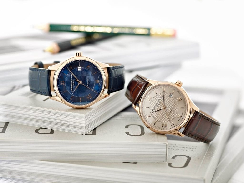 Proposé en acier inoxydable ou plaqué or rose, le boîtier poli (40 mm) souligne subtilement le design intemporel du cadran, orné d’index et de chiffres romains en applique. Guilloché « Clous de Paris » en son centre, celui-ci est cadencé par trois aiguilles, complétées d’un guichet de date à 3 heures. . . Toute en acier ou habillée d’un bracelet de cuir selon les versions, cette nouvelle pièce horlogère bat au rythme du mouvement automatique FC-303, assorti d’une réserve de marche de 38 heures. Pile à l’heure des valeurs sûres, cette montre de ville séduira les adeptes d’un porter résolument classique.