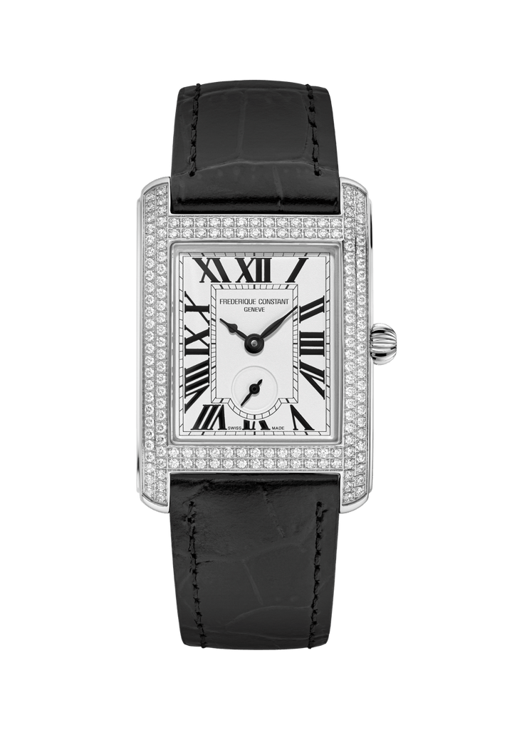Il y a tout juste un siècle, dans les années 1920 – 1930, l’horlogerie se libérait de la boîte ronde pour inventer des formes carrées et rectangulaires. Toujours très prisée, cette esthétique Art Déco se renouvelle aujourd’hui avec Frederique Constant qui lance la Classics Carrée Small Seconds, déclinée en trois modèles. À une première version richement sertie répond une déclinaison 100% acier (boîte et bracelet), complétée d’une dernière proposition épurée et abordable, en boîte acier sur bracelet cuir. Elles partagent toutes un mouvement quartz doté de deux ans d’autonomie, un cadran argenté à deux aiguilles centrales et une petite seconde décentrée survolant une minuterie « chemin de fer » et de larges chiffres romains. So glam.