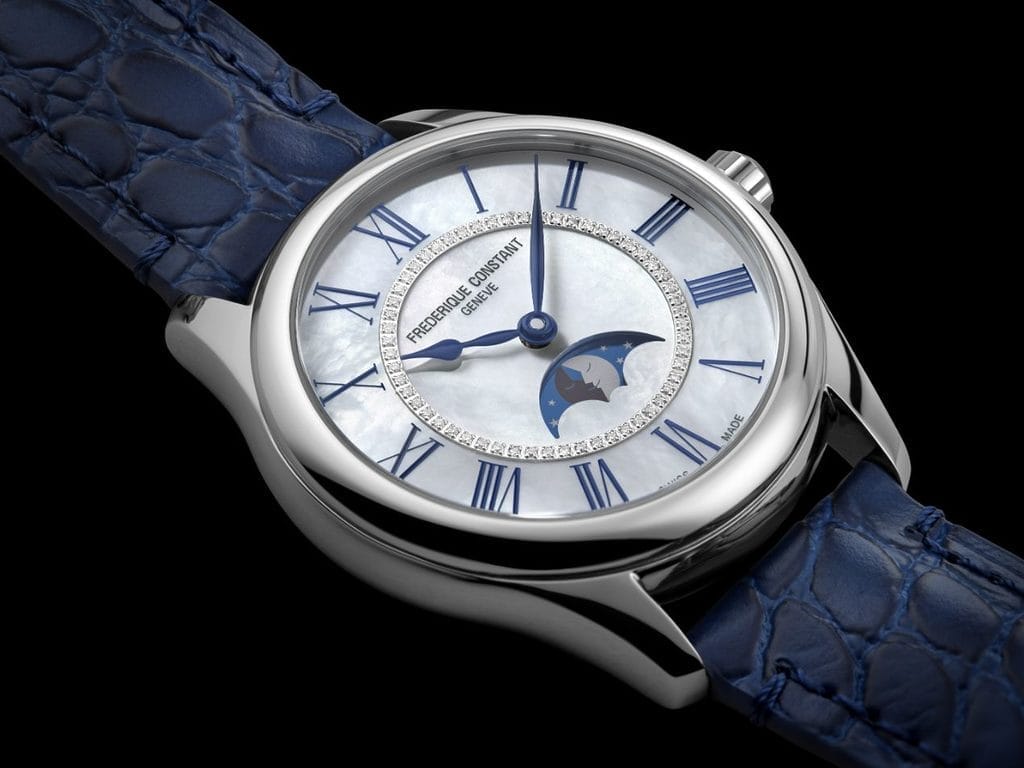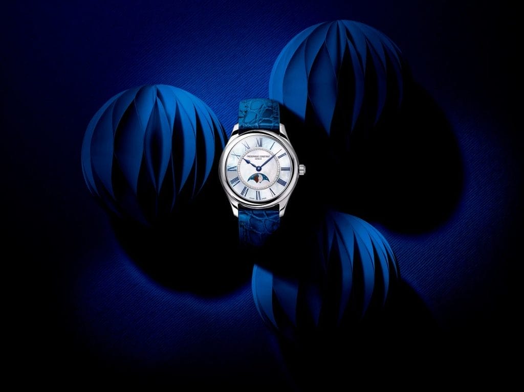 Certains regards sont plus innocents que d’autres. Lorsque la fille du Directeur Recherche & Développement de la Maison Frederique Constant se plaît à rêver d’une phase de lune, elle l’imagine loin des standards habituels. Son approche n’est pas celle d’un designer, ni d’un horloger. Plutôt celle d’une poésie amoureuse et bienveillante où deux moitiés de lune se rencontrent et s’embrassent sur un fond étoilé.