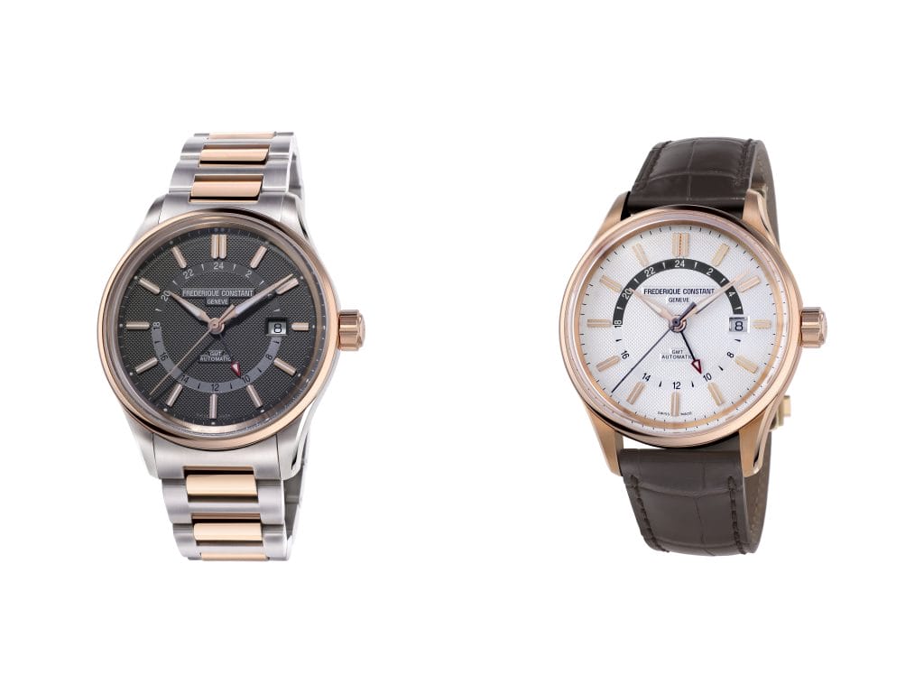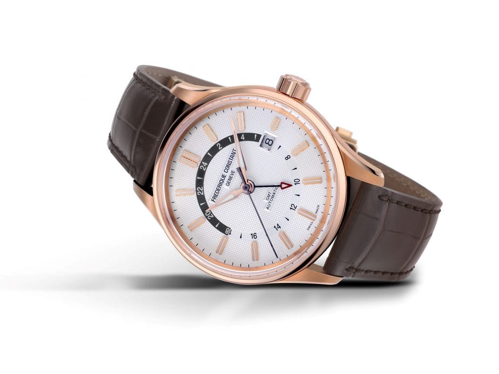 Outre sa lisibilité, cette pièce horlogère se règle facilement, via la couronne. Embarquant le mouvement automatique FC-350, doté d’un module GMT de manufacture, visible par le fond transparent du boîtier, elle bénéficie d’une réserve de marche de 38 heures.