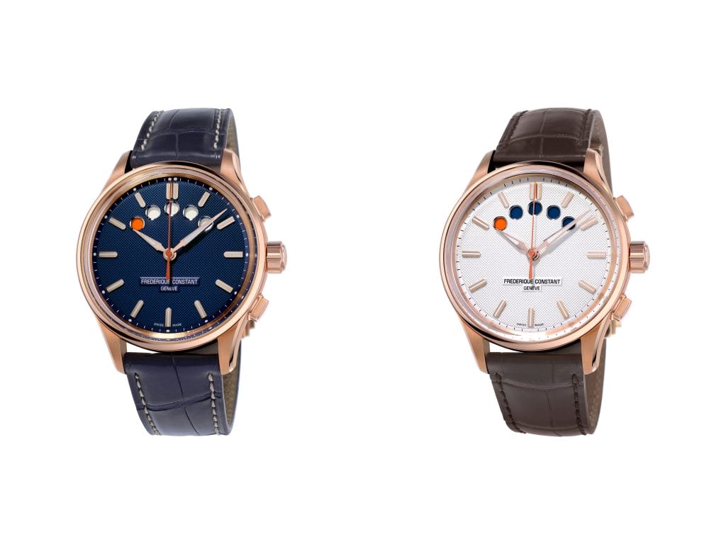 Quatre modèles viennent d’ores et déjà gonfler les voiles de cette nouvelle collection proposée dans un boîtier de 42 mm de diamètre, étanche jusqu’à 100 mètres. Deux sont en acier plaqué or rose, dotés d’un cadran argenté ou bleu marine et montés sur bracelet alligator. Bicolore, la troisième version marie l’acier et l’or rose, sur un bracelet lui aussi à deux tons. Sobre et contemporain, la quatrième variation privilégie l’acier, mis en valeur par un cadran argenté, le tout habillé d’un bracelet alligator noir. Pour chaque modèle, Frédérique Constant fournit également un second bracelet en caoutchouc noir qui saura résister durablement aux embruns.