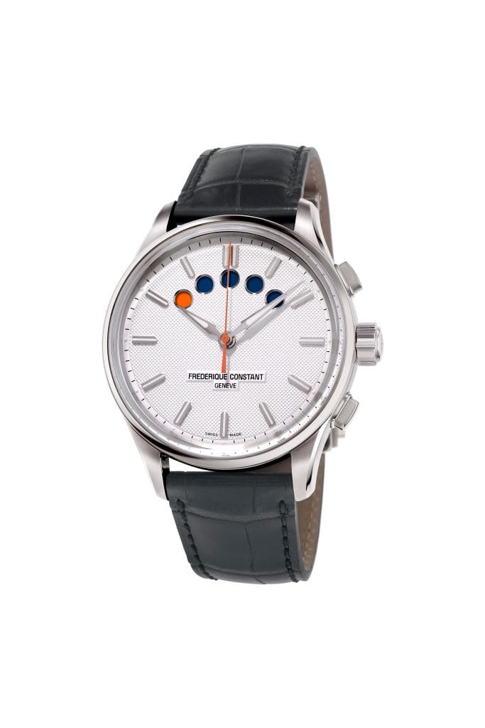 Frédérique Constant signe donc ici non pas un garde-temps « d’inspiration nautique » mais une véritable montre de régate, opérationnelle en conditions de course. Modèle de lisibilité, l’affichage originel de 1997 a été préservé. Il se compose de cinq points au sommet du cadran. Chaque point représente 1 minute. Un premier décompte (engagé par le poussoir du haut) fait progressivement passer tous les points en blanc ou bleu (couleur opposée à celle du cadran). Ainsi, lorsque les 5 points sont colorés, 5 minutes sont écoulées.