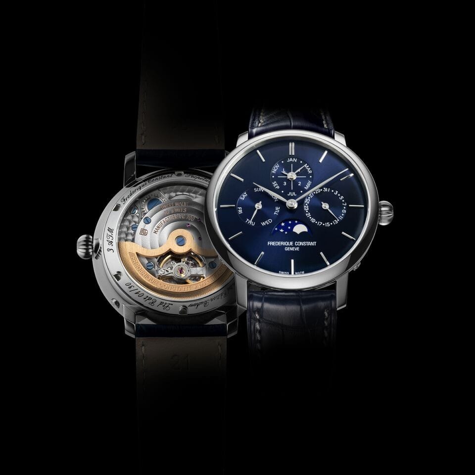 Produit et assemblé par les horlogers Frédérique Constant dans les ateliers de Plan-les-Ouates, ce garde-temps est animé par le calibre de manufacture FC-775 à remontage automatique, entraînant les aiguilles des heures et des minutes ainsi que celle du quantième perpétuel. Il ne mesure que 6,7 mm d’épaisseur, affiche une fréquence de 4 Hz (28 800 alternances par heure), possède 26 rubis et dispose d’une réserve de marche de 38 heures. Les finitions de ses 191 composants, réalisées sur les machines CNC Frédérique Constant, assurent une précision à long terme des fonctionnalités de cette pièce horlogère.