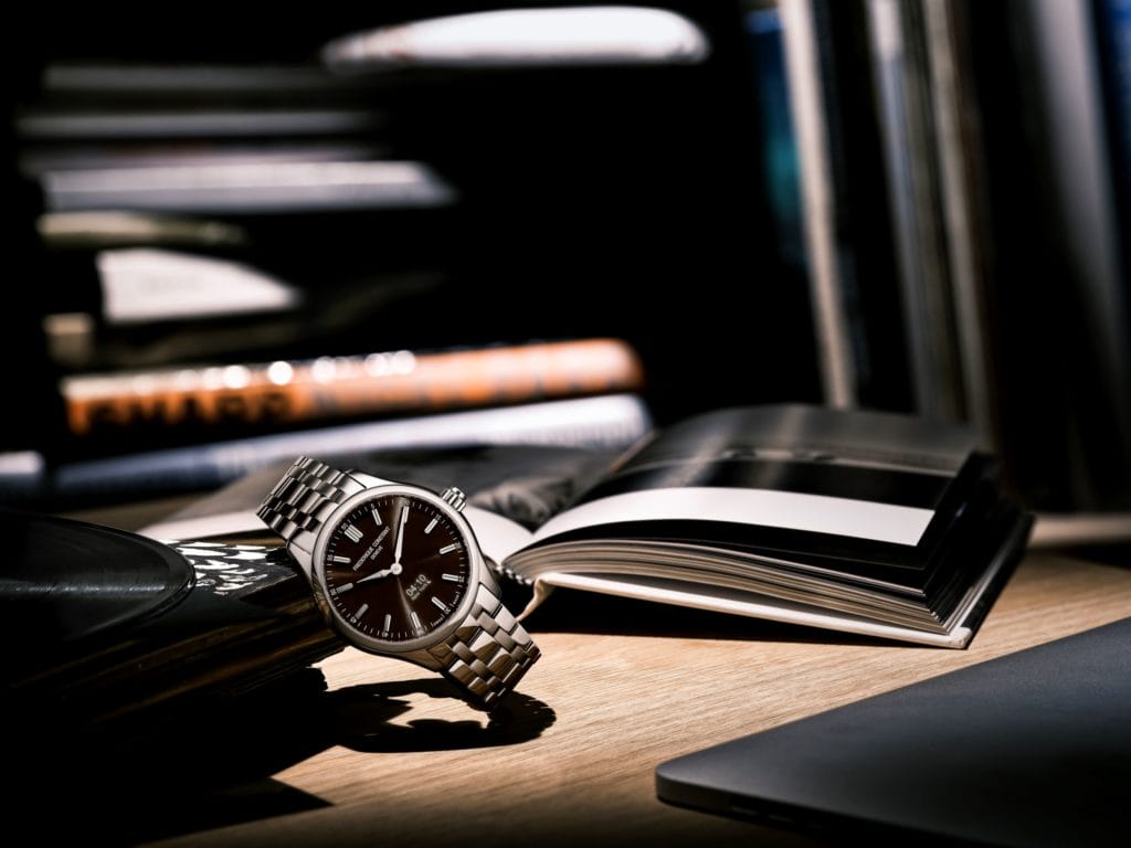 La seconde s’adresse aux amateurs du bracelet acier. Venant habiller un boîtier également en acier, finalisé d’un audacieux cadran chocolat soleillé, celui-ci est particulièrement travaillé. Composé de cinq maillons articulés alternant les finitions polies et satinées, il est le seul bracelet de ces nouvelles déclinaisons à boucle déployante.