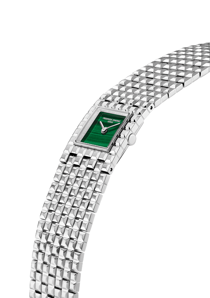 – Classics Manchette Malachite : cadran en pierre naturelle verte aux reflets marmoréens, logé dans un boîtier en acier poli. Prix public : 1 895 €.