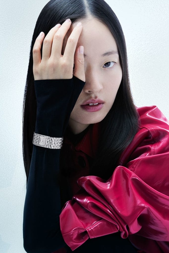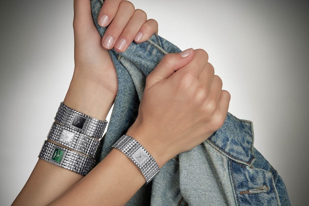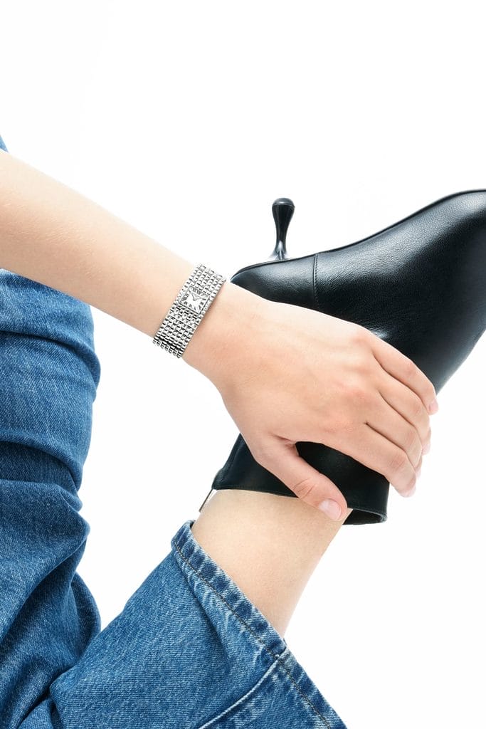 La nouvelle Classics Manchette reprend la silhouette d’un bracelet souple en acier, composé de sept maillons Clous de Paris. Le cadran carré, intégré au centre, affiche uniquement les heures et les minutes — comme une signature discrète logée dans un volume ornemental. La montre épouse le poignet avec fluidité grâce à une boucle déployante invisible, pensée pour résister à l’épreuve du quotidien autant qu’à celle d’un dancefloor.
