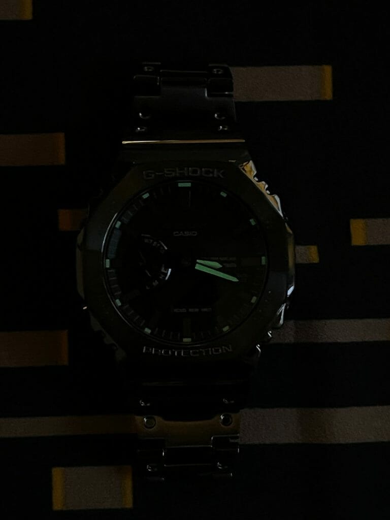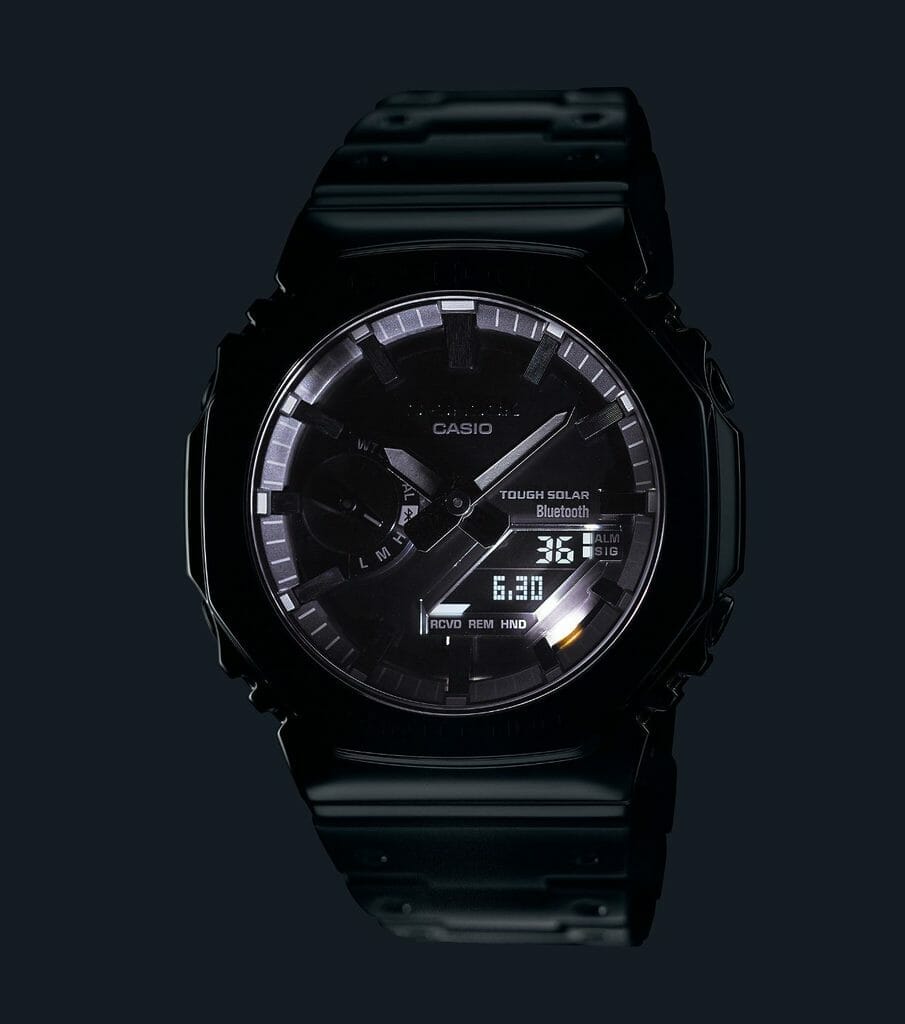 Afin de garantir sa résistance, la structure antichoc initialement conçue pour le modèle GMW-B5000 a été adaptée aux finitions des joints du boîtier, du bracelet et de la lunette vissée de la 2100. Enfin, des techniques de moulage de haute précision permettent de créer des renforts en résine qui s’insèrent entre la lunette et le boîtier. Gage de résistance aux chocs, condition sine qua non du « label » G-Shock !