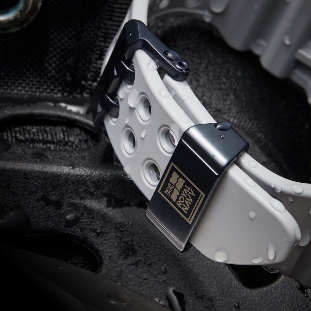 Conçue en collaboration avec la Royal Navy, la GWF-A1000RN-8AER a été conçue pour s’adapter aux environnements hostiles auxquels est confronté le personnel de la marine, en mer et sur terre, et utilise une structure Carbon Core Guard. Cette structure, associée à la résistance aux chocs G-SHOCK de renommée mondiale et à l’étanchéité en plongée ISO 200m, crée une structure hautement résistante aux vibrations et complètement étanche. La certification ISO atteste que la montre est destinée aux plongeurs professionnels.