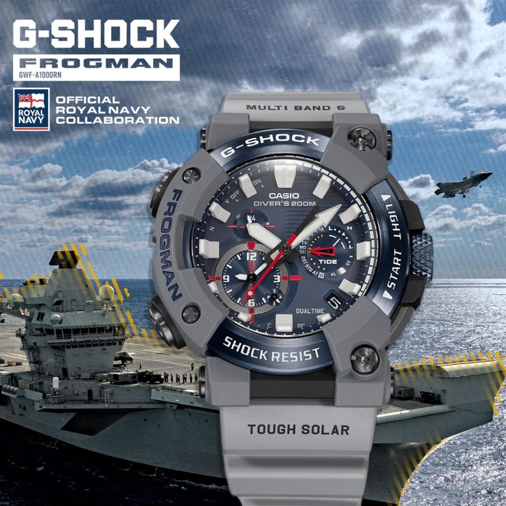 La GWF-A1000RN-8AER présente des éléments de design directement inspirés de l’histoire navale britannique. L’esthétique unique s’inspire du HMS Queen Elizabeth, le plus grand porte-avions de la Royal Navy. La palette de couleurs immédiatement reconnaissable de la Royal Navy (rouge, blanc et marine) est saisissante et le gris clair vient en contraste pour reproduire la coque du navire.