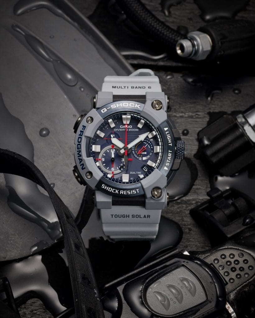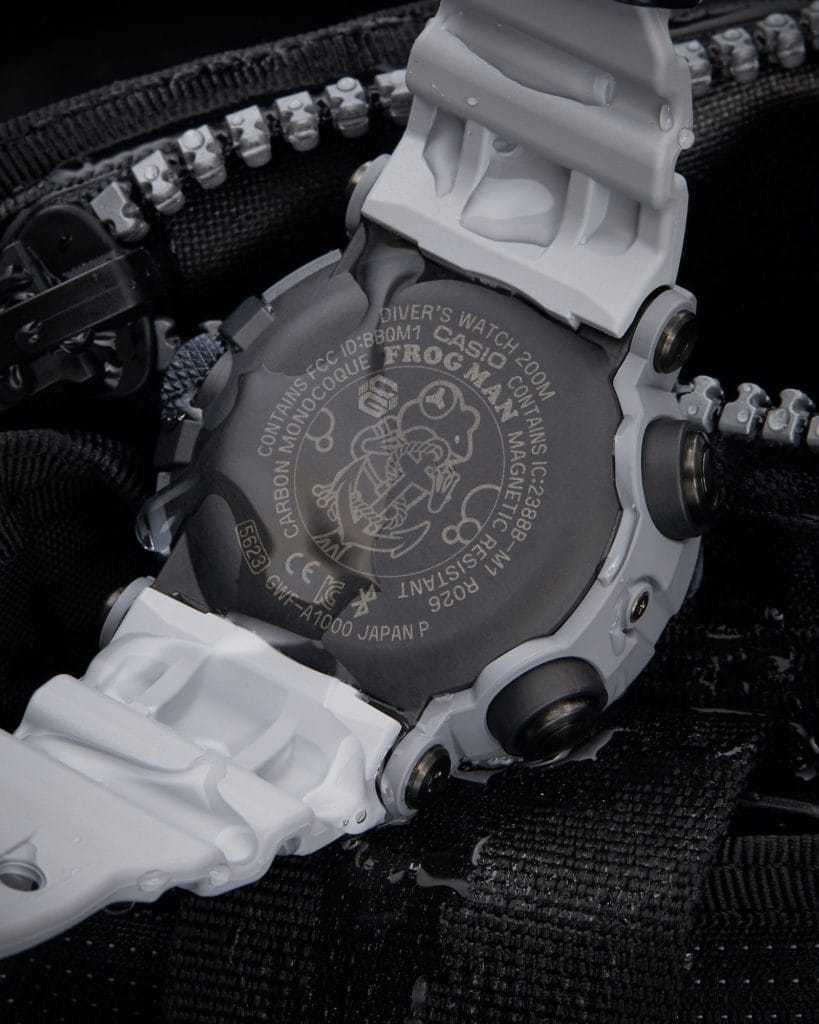 La structure Carbon Core Guard est combinée à un boîtier monocoque en carbone sur lequel est gravé une grenouille au dos (d’où le nom FROGMAN). Une résine renforcée de fibres de carbone est utilisée pour le matériau du boîtier, offrant une grande résistance et une faible absorption. Six vis fixent solidement la lunette métallique superposée au verre. L’étanchéité est renforcée par le triple joint inséré dans les boutons.