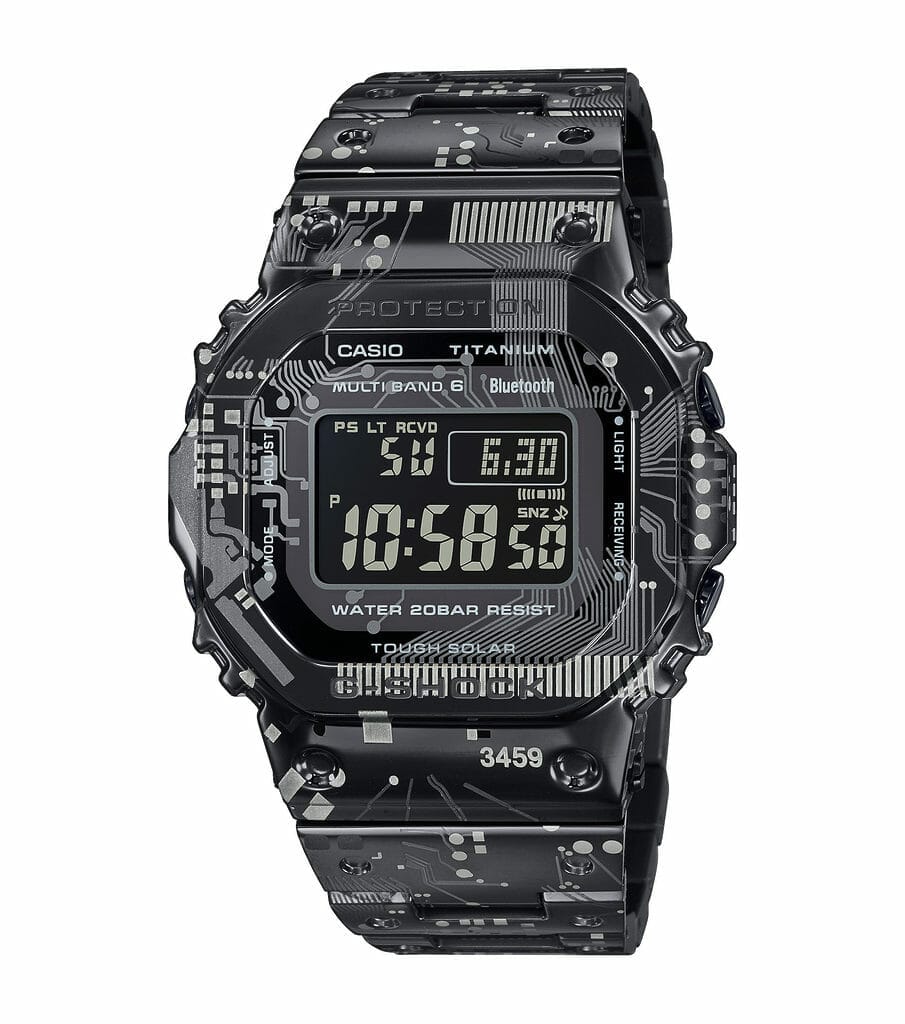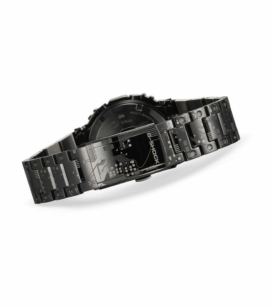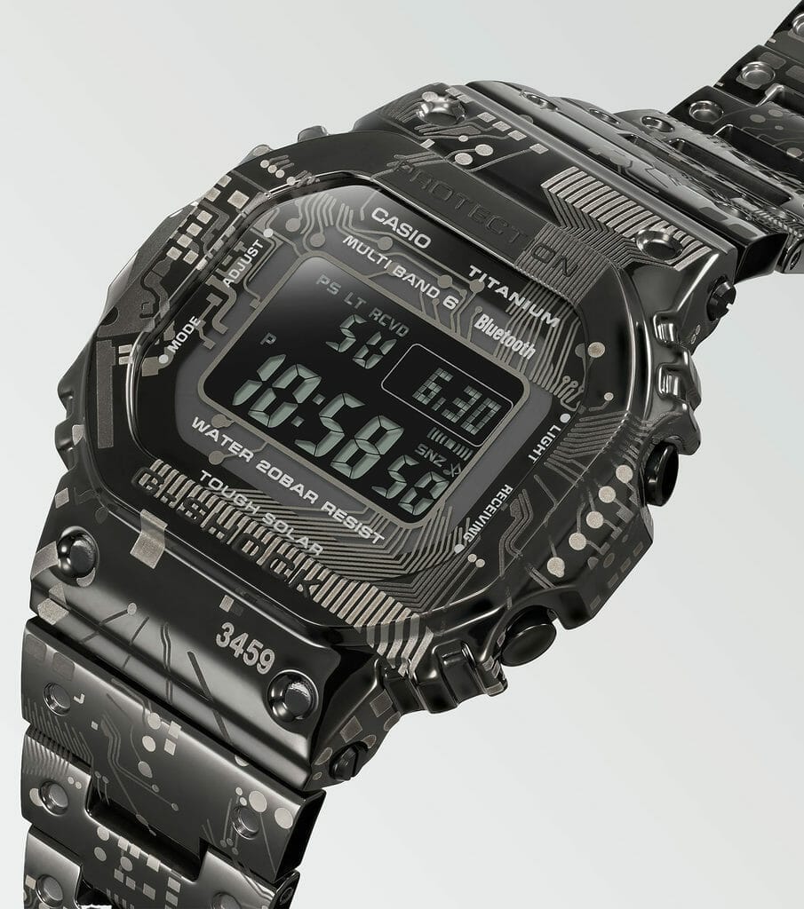 Le design de la montre s’inspire des circuits du module 3459 utilisé dans la série GMW-B5000 et cet imprimé a été apposé par un placage ionique noir et une gravure au laser.