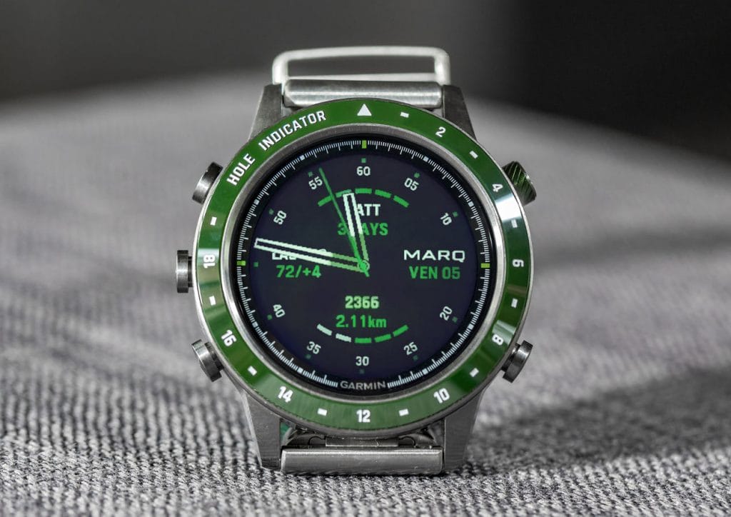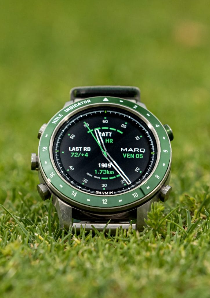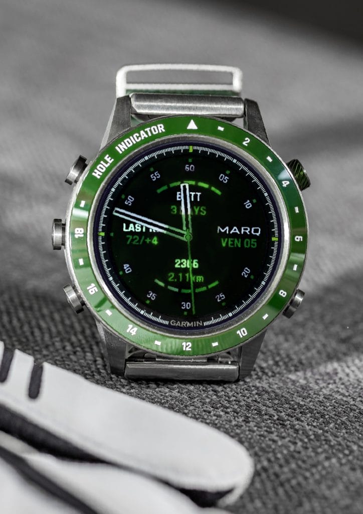 Véritable ordinateur, elle est équipée des données de plus de 41 000 parcours répartis dans le monde entier. Avec les cartes Course View en couleur qui s’affichent directement au poignet, la Marq Golfer permet de déterminer facilement les distances en entrée, milieu et fond de green. Ses fonctionnalités conçues pour améliorer la performance sont multiples : Distance PlaysLike, pour ajuster la distance du coup en fonction des dénivelés, Hazard View pour visionner l’ensemble des obstacles sur la carte ainsi que AutoShot la fonction d’analyse pour mesurer et enregistrer la distance détectée des coups.