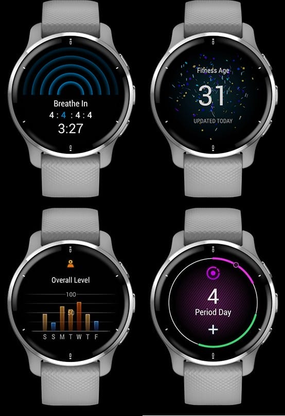 Venu 2 Plus accompagne les utilisateurs vers une vie plus saine avec une large gamme de fonctions de suivi de santé disponibles 24h/24 7j/7, en particulier le suivi de la fréquence cardiaque (avec la possibilité de configurer des alertes en cas de fréquence basse ou haute2 ), l’analyse avancée du sommeil avec Firstbeat AnalyticsTM, l’âge fitness, le suivi de la respiration, le taux d’oxygène dans le sang avec Pulse Ox, le niveau de stress, l’hydratation et, pour les femmes, le suivi de grossesse ou du cycle menstruel. Le moniteur d’énergie Body BatteryTM indique le niveau d’énergie du corps en prenant notamment en compte les effets induits par le stress et la pratique d’activités physiques. Enfin, l’aperçu de santé Health SnapshotTM permet de générer, en quelques minutes, un rapport compilant les principales statistiques de santé, qui peut ensuite être partagé avec un professionnel pour une analyse approfondie. C’est un outil idéal pour recueillir des données physiologiques à chaque fois que l’utilisateur se sent en décalage avec son état physique de référence.