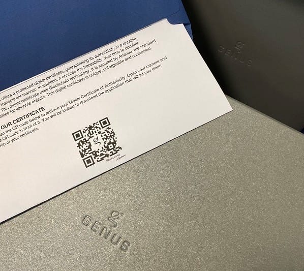Pour garantir auprès de son possesseur l’authenticité du garde-temps tout au long de sa vie, GENUS s’est rapproché de l’association Arianee Project, un consortium indépendant dont la mission est de construire un standard global pour la certification digitale des objets de valeurs. Basé sur la technologie de la Blockchain, le protocole décentralisé et open source offre un ensemble de nouveaux services, pour le propriétaire de la montre, accessibles directement depuis le certificat.