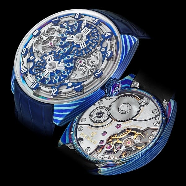 En 2020, GENUS propose la déclinaison de son modèle GNS en l’installant dans un nouveau vaisseau de métal. Après l’or gris, l’or rose, GENUS s’aventure sur un territoire nouveau pour l’horlogerie en utilisant une boîte en titane damassé, d’où le nom GNS 1.2 TD (Titane Damassé) . De son nom technique damassage de corroyage, cette technique ancestrale nécessite un savoir-faire rare. A tel point qu’elle est classée à l’Inventaire du patrimoine culturel immatériel en France. Il s’agit d’un travail artisanal, largement manuel, réservé aux meilleurs forgerons. Il porte le nom de Mokume-gane au Japon, où il sert à la fabrication de lames de katana depuis le début du 17e siècle.