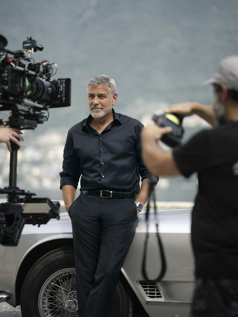 Pour ce shooting, George porte le modèle en acier inoxydable avec un cadran bleu PVD (réf: 332.10.41.51.03.001). Parmi les nouveaux portraits, l’acteur peut être vu portant la montre tout en conduisant une voiture de collection près de sa maison autour du lac de Côme – un clin d’œil aux origines de course de la Speedmaster.