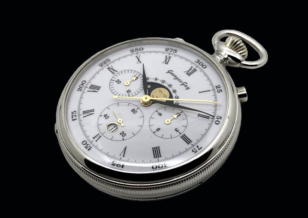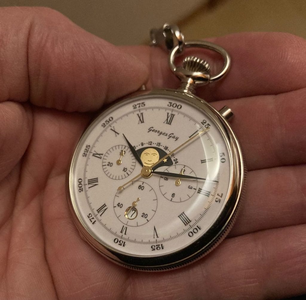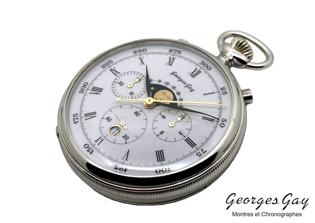 Le modèle Georges Gay Héritage 7760 est une réédition unique d’un chronographe de poche datant du milieu des années 70’. Cette pièce comporte un mouvement mécanique Valjoux 7760 dans une boite cannelée en argent 0,925. Son cadran blanc est composé de trois compteurs, de la date et de l’indication de phase de lune. Ce garde-temps est un magnifique témoin d’un savoir-faire horloger aux Bioux et à la Vallée de Joux.