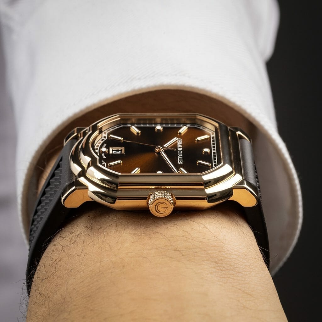Si la précision des montres Gerald Charles est reconnue, l’ergonomie et la facilité d’utilisation sont tout aussi importantes pour la Maison. L’un des points forts de la Maison est assurément le confort. Comme le fond du boîtier, les cornes et le bracelet sont alignés sur la même ligne droite, la montre peut reposer bien à plat sur le poignet, devenant ainsi ce que l’on peut définir comme ‘une montre ergonomique’.