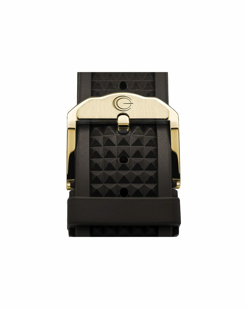L’ensemble est complété par un bracelet en caoutchouc vulcanisé, avec motif Clous de Paris sur la face supérieure et la signature stylistique GC en tapisserie à l’intérieur du bracelet, équipé d’une boucle à ardillon polie avec plaque appliquée brossée comportant là-aussi la signature distinctive GC.